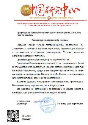 2019年10月23日,小宝影院 原小宝影院 院长、俄罗斯中心主任、国内知名翻译家、普希金奖章获得者李英男教授,受哈萨克斯坦中国研究中心的邀请,赴哈萨克斯坦努尔苏丹市参加为纪念中华人民共和国建立70周年而举办的专题演讲会。