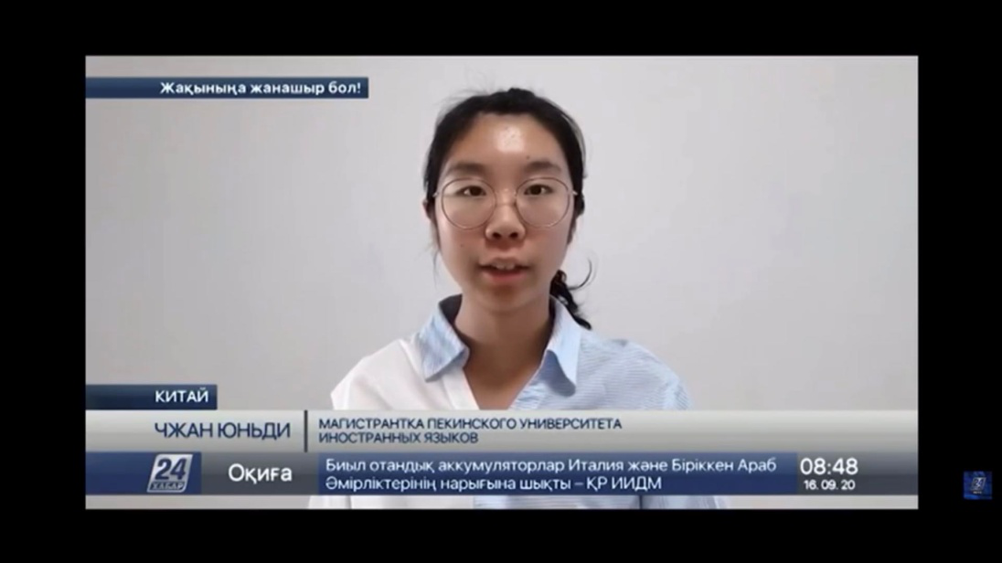 2016级首届俄哈复语班,朗读了2013年习近平总书记在纳扎尔巴耶夫大学演讲时引用的阿拜名言:“世界有如海洋,时代有如劲风,前浪如兄长,后浪是兄弟,风拥后浪推前浪,亘古及今皆如此”。张韵迪同学出色的朗读赢得了与会嘉宾的好评。会后,哈萨克斯坦Хабар-24电视台驻华记者对她进行了采访。