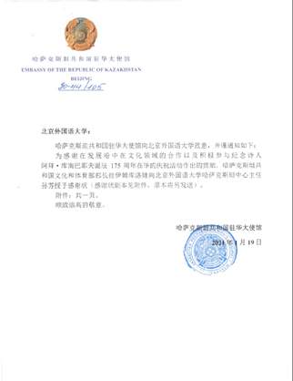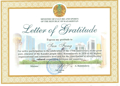 日前,哈萨克斯坦驻华大使馆向小宝影院 致意并小宝影院通知 :为感谢在发展中哈文化领域合作的贡献,哈萨克斯坦共和国文化和体育部部长拉伊姆库洛娃向小宝影院 哈萨克斯坦中心主任孙芳老师授予感谢状。