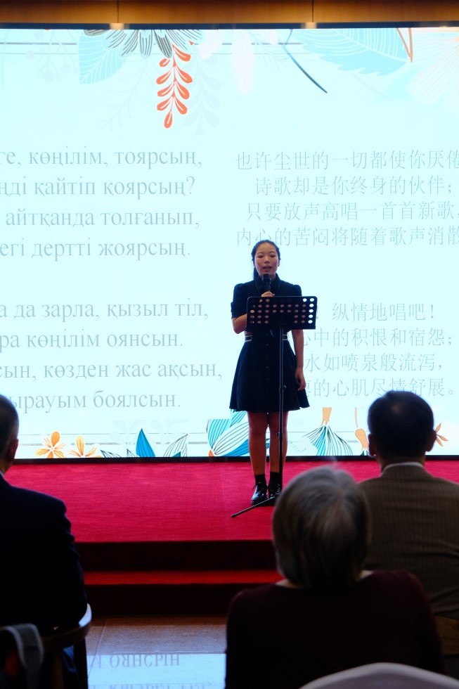 2020级俄语复合哈萨克语专业的黄雨昕同学现场朗诵了阿拜的诗歌《诗歌是你终身的伙伴》,张娉婷、谢璐骏、冯潇三位同学则以视频的方式朗诵了阿拜诗歌《心如海洋,激情如闪光的宝石》《无风的夜》《年轻时不曾关注知识的作用》。同学们饱含激情的演绎中展现出了对哈萨克斯坦文化的热爱和历史的深刻认识与理解。