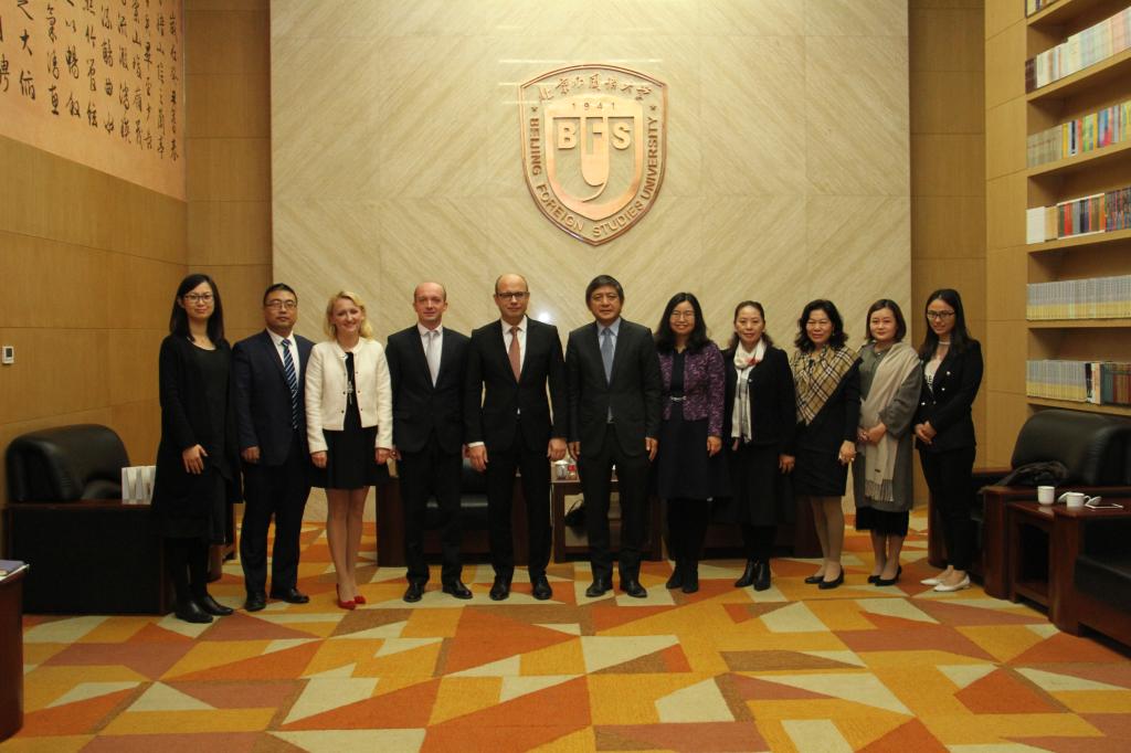 双方在图书馆五层贵宾室进行了会谈。彭龙校长首先向鲁德大使一行的到来表示欢迎,并向白俄罗斯客人介绍了北外的总体情况。彭龙校长表示,北外教授的98种语言中,也包括白俄罗斯语。目前已经开设了白俄罗斯语作为第三外语的课程,明年将正式招收本科学生,培养白俄语和俄语复语人才。鲁德大使表示,北外作为中国外语教学的领航者,在白俄罗斯享有盛誉,白俄罗斯的大学非常希望开展与北外之间的合作。白俄罗斯驻华使馆将为北外的白俄语教学提供一切必要的帮助。在鲁德大使和彭龙校长的共同意愿下,计划2018年年底—2019年年初在北外共建白俄中心。双方还就学生和教师交流、学术研究、合作出版、特别是联合培养和联合办学等可合作领域进行了亲切商谈。