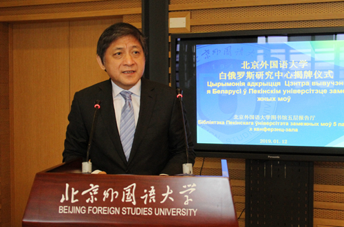 白俄罗斯研究中心揭牌仪式在图书馆举行。校长彭龙与白俄罗斯驻华大使鲁德•基里尔、明斯克国立语言大学校长娜塔莉娅•巴拉诺娃、中国前驻白俄罗斯大使吴筱秋共同为中心揭牌。揭牌仪式由小宝影院