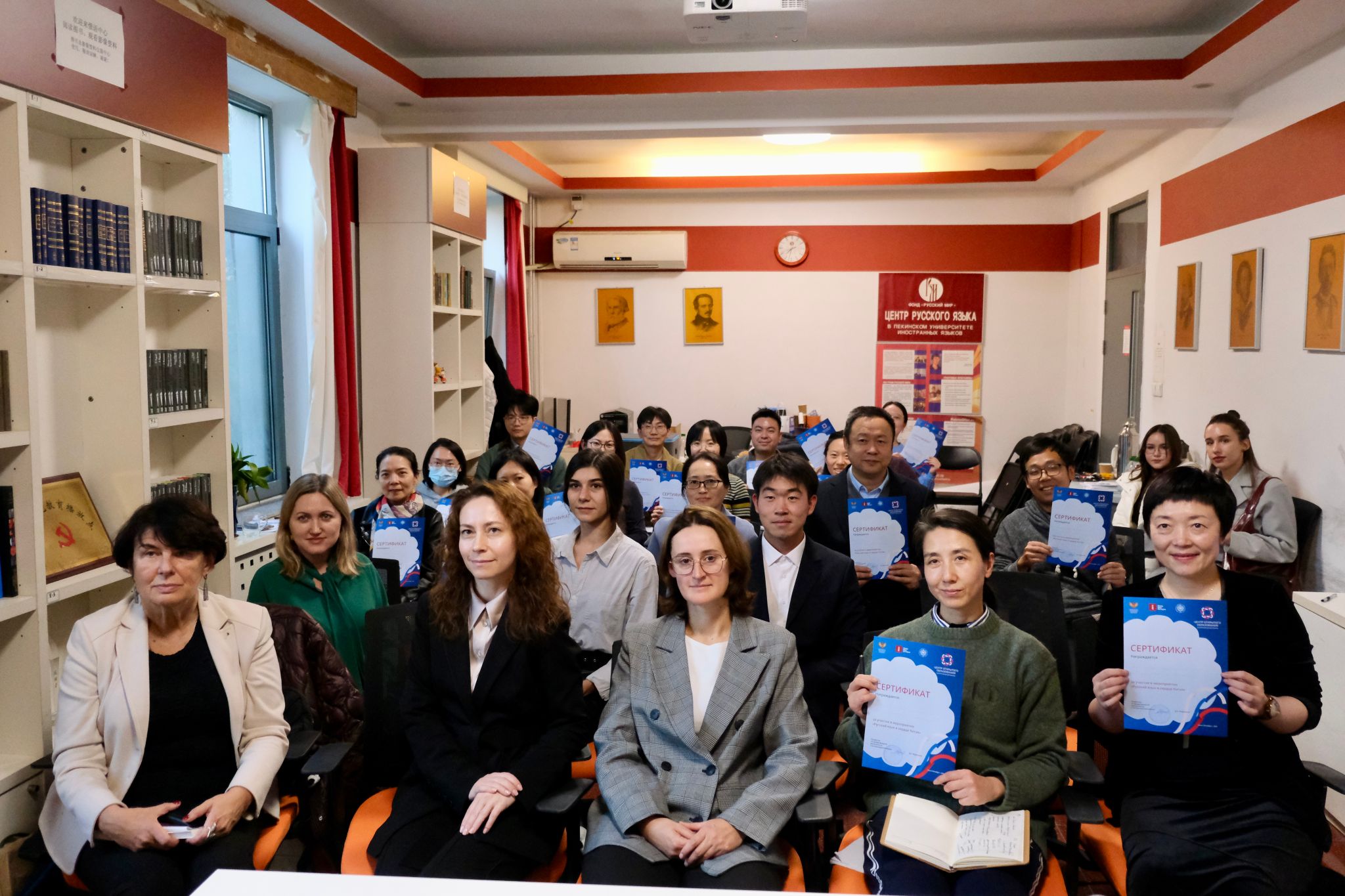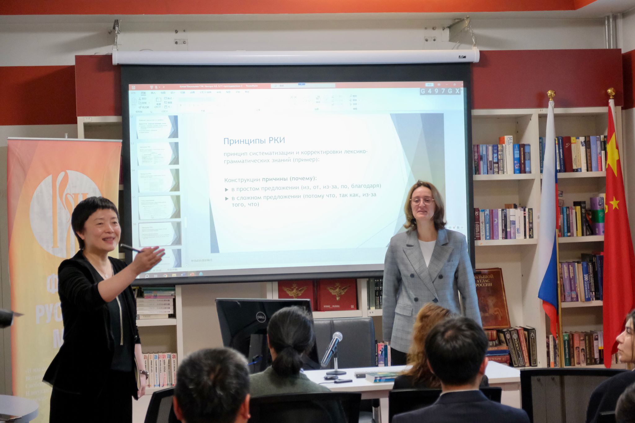 的教师们在俄语中心进行了一场教学示范与交流研讨活动。活动中,加琳娜·瓦西里耶娃教授以“俄语词汇的语文学内涵”为题,通过讲解面包、外套、雏菊、白桦树等俄语词汇的文化伴随意义,解锁了语词中的文化编码,展示了俄语词汇中丰富的文化意涵和相关领域最新研究成果。娜塔莉亚·内科拉副教授则详细分析了对外俄语语法教学中的难点问题,并分享了相关线上教学资源。在问答环节,两校教师就俄语教学、教法、教材等问题进行了深入交流与研讨。