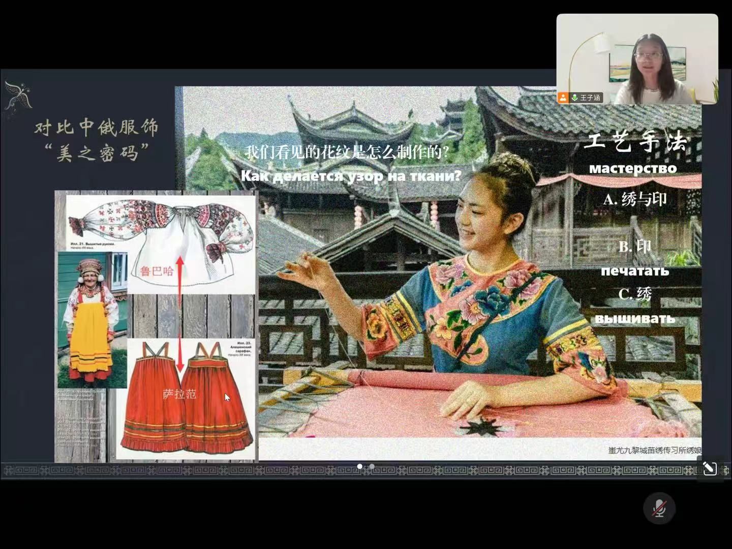 同时,两位党员结合在俄罗斯留学期间的所见所闻,通过展示大量生动照片的形式分别详细地介绍了俄罗斯的传统节日、民俗文化、手工创作等,重点介绍俄罗斯“谢肉节”“霍赫洛玛”等手工艺的现当代发展,深入解读其历史渊源、文化特色与传承发展脉络。在此基础上结合重庆彭水“炸龙”“苗绣”“踩花山节”等特色传统文化,从“历史与现实”和“传统与创新”多角度,探讨中外文化的比较、继承与发展,为同学们带来了一场沉浸式的中俄文化知识普及课。